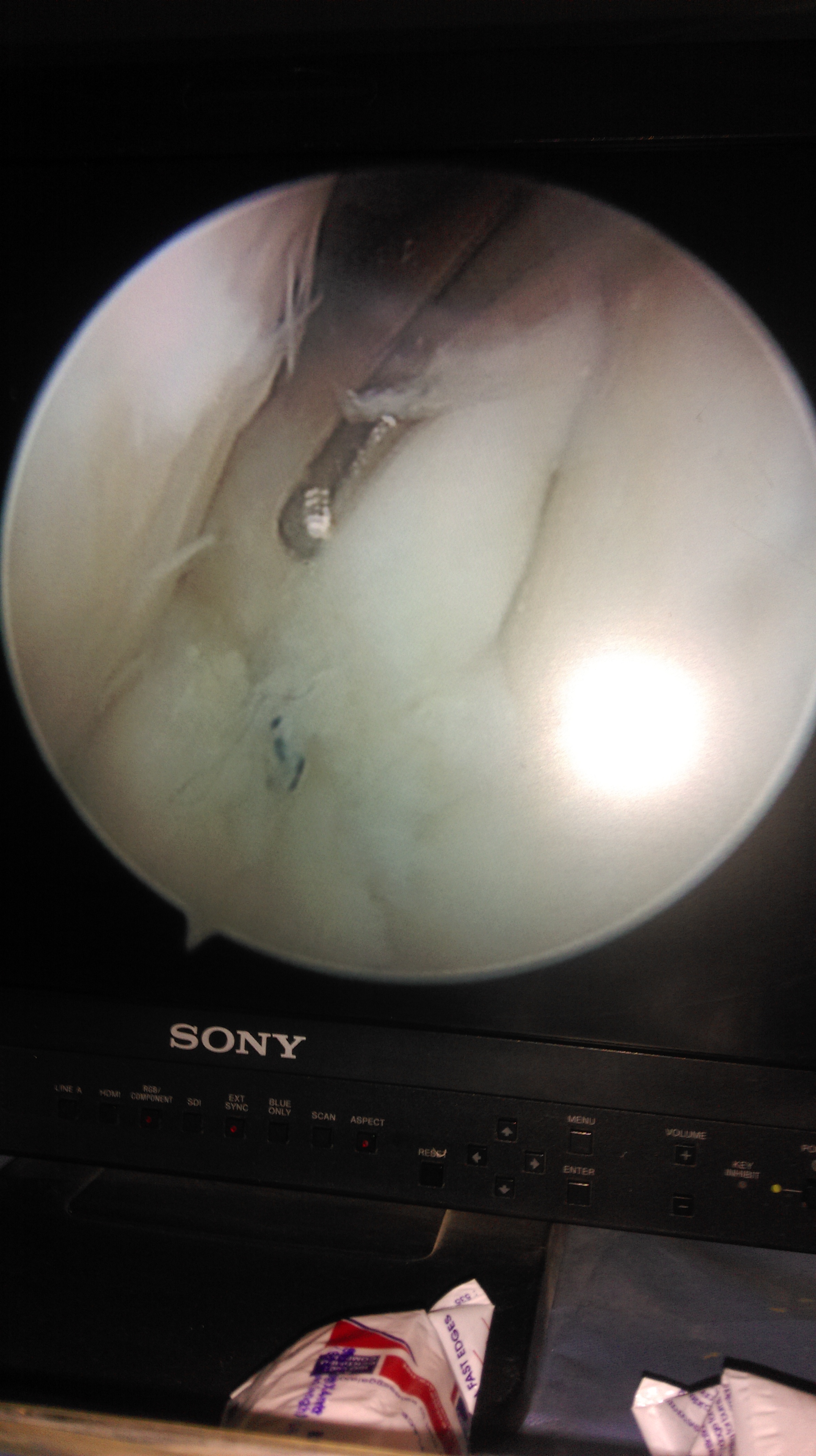 Orthopaedic surgeons perform arthroscopic surgery by making a small incision in the patient’s skin and inserting pencil-size instruments that contain a small lens and lighting system to magnify and illuminate the structures inside the joint. A fibre optic cable transmits light to the end of the arthroscope inserted into the joint. An arthroscope is attached to a miniature camera so the surgeon can see inside the joint through this small incision rather than a larger one required for open surgery.