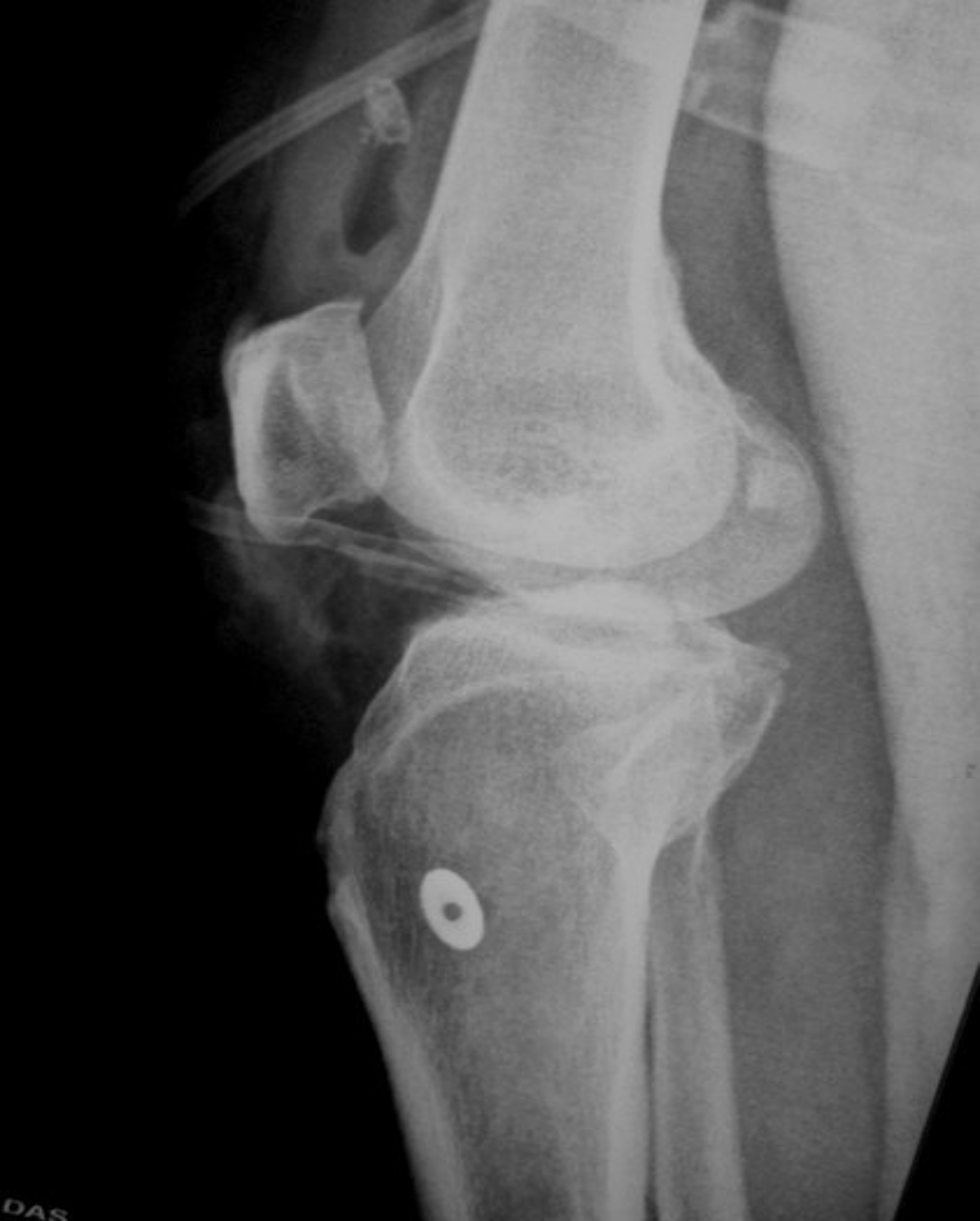 - Suture ends are delivered anteriorly through the tunnel and pulled to reduce the fragment and tied over the suture washer with knee in extension.