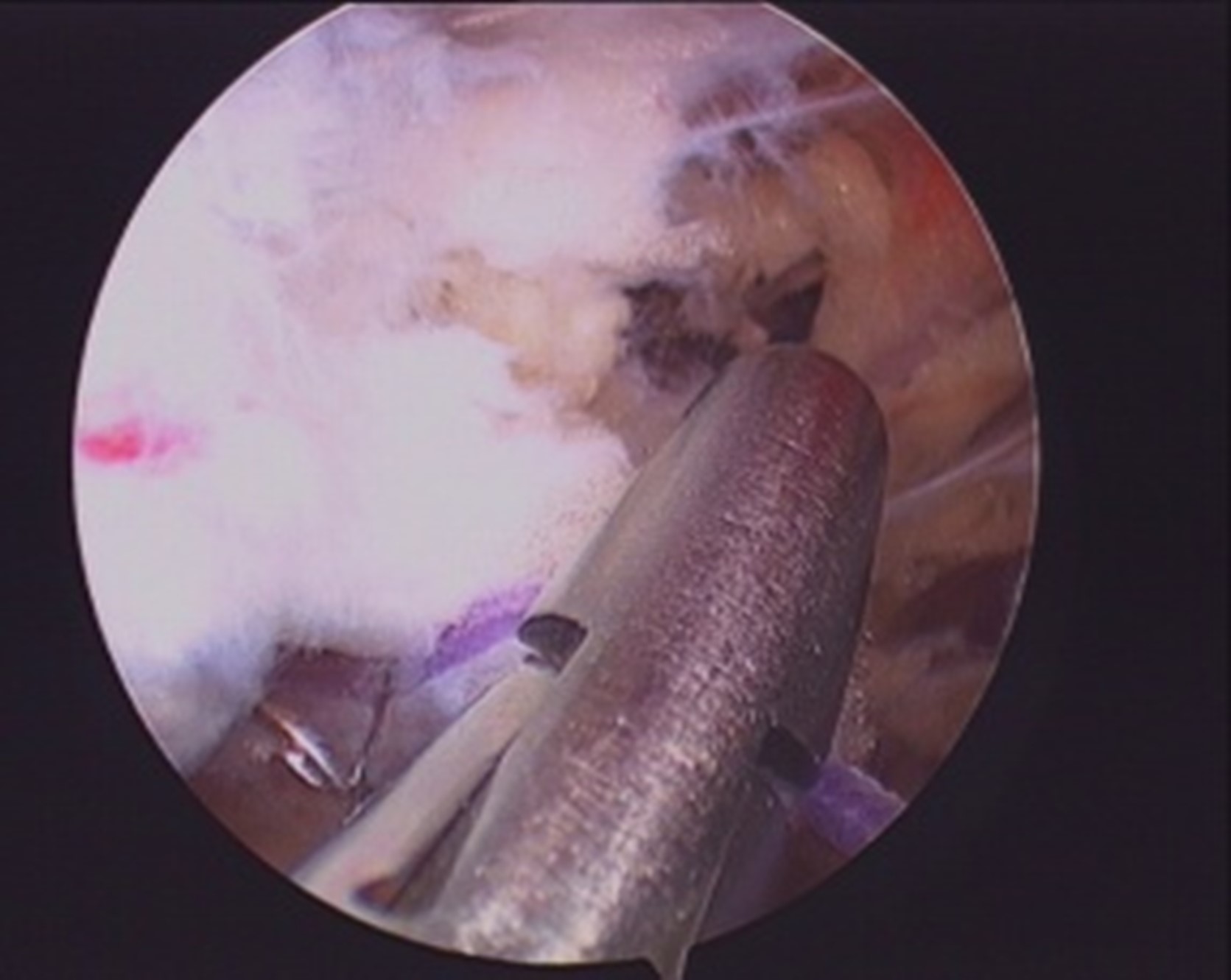 - Both ends of the suture loop are delivered posteriorly through inferior PM portal and sliding knot is passed and sitted over the osseo-ligamentous fragment.fig 3, 4.